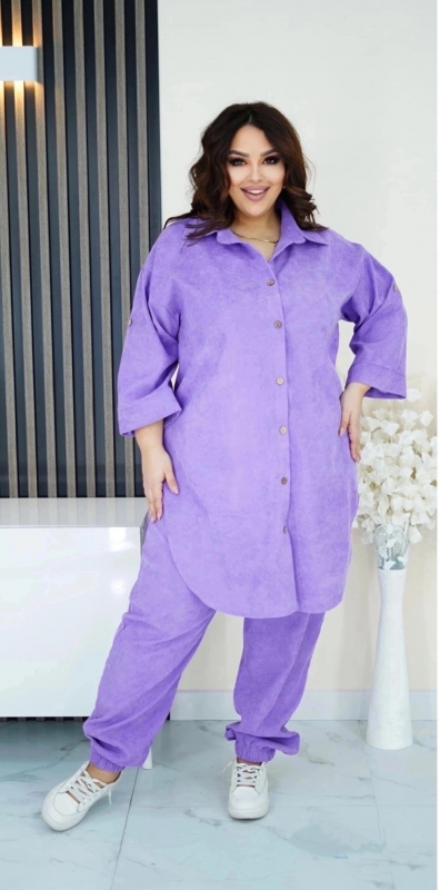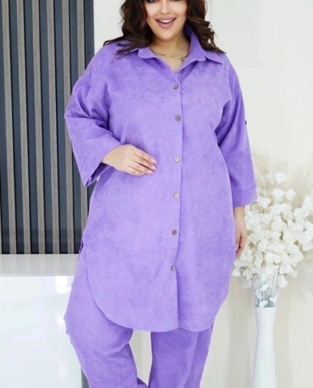 Шикарный костюм двойка из микровельвета состоит из рубашки и брюк. Ткань тонкая, но не рыхлая, приятная, слегка эластична для улучшения посадки по фигуре.