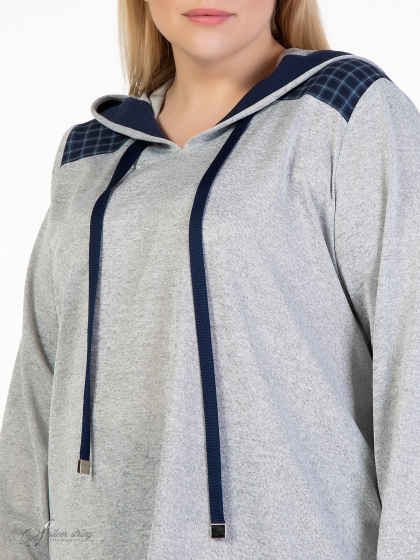 Эффектный блузон прямого силуэта, в спортивном стиле, выполнен из материалов-компаньонов: однотонного трикотажного полотна и ткани с рисунком в клетку. Модель с капюшоном и длинным втачным рукавом. Лицевой вырез капюшона обработан планкой контрастного цвета, и в нее вложен шнур – затяжка. На полочке расположены кокетки. Низ рукава присобран на трикотажную манжету. Модель выполнена с учетом особенностей фигуры полных дам и позволяет обеспечить отличную посадку и максимальный комфорт.