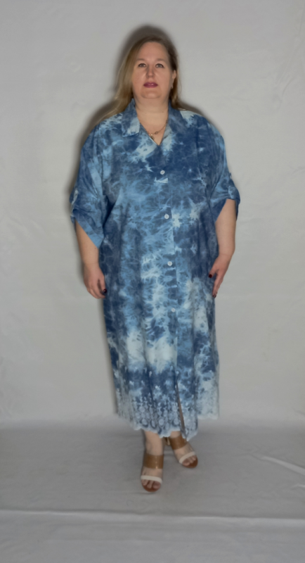 Шикарное   платье из  облегченной, рубашечной джинсы с эффектом "варенки"  и вышивкой по низу платья и рукавов.