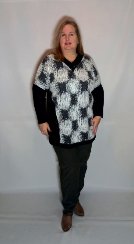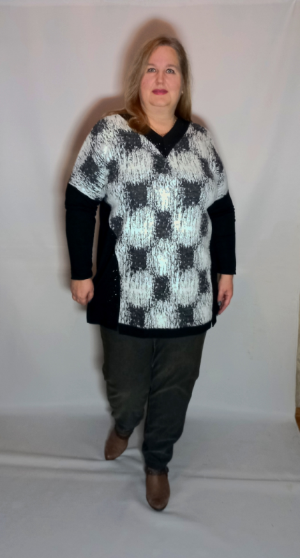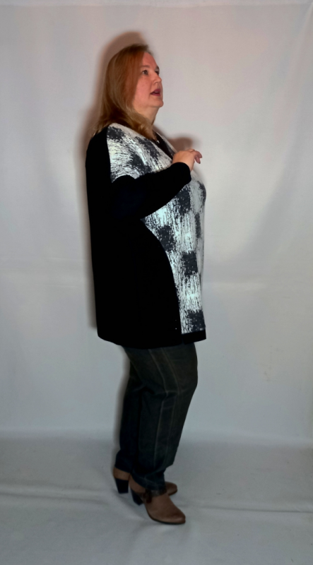 Полочка сложнокроенная: боковые вставки черного цвета, декорированы черными термостразами. Средняя часть полочки из трикотажа "альпака"