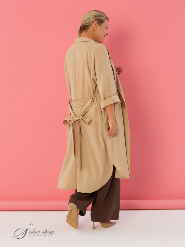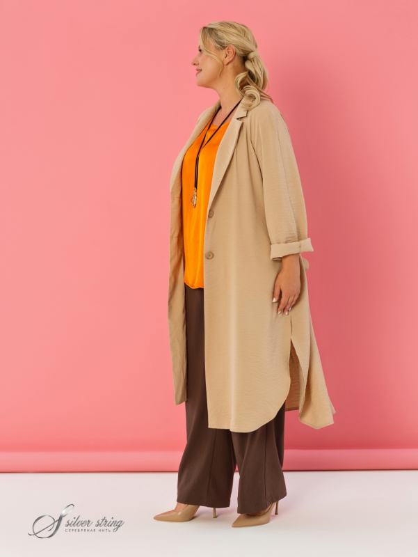 Удлиненный жакет - «шазюбль» прямого силуэта выполнен из фактурной смесовой ткани с большим содержанием натурального волокна. Модель с английским воротником на углубленной горловине и застежкой на крупные пуговицы. Рукав длинный, покроя реглан. Низ рукава можно носить «на отворот»: тем самым регулировать его длину по своему усмотрению. Изделие с удобными карманами в швах и съемным поясом. Линия низа асимметричной формы: спинка значительно удлинена относительно полочки. В боковых швах обработаны высокие скругленные разрезы. Один из главных плюсов шазюбля — его универсальность, отличная способность сочетаться с вещами в разнообразных стилях и дополнять разные комплекты. Шазюбль можно носить с брюками, юбками, платьями; с длинными и короткими вещами, с классической, спортивной и одеждой в стиле «Casual». Второй плюс — способность создавать вертикаль и вытягивать фигуру, скрывая недостатки и добавляя стройности.